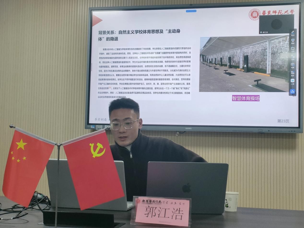 2026年1月19日晚,体育科学学院主办的体育学科前沿系列学术活动在仁智楼B301会议室顺利举办。本次研习报告特邀华东师范大学体育与健康学院博士研究生郭江浩,以《人工智能时代学校体育若干议题漫谈》为题开展分享。活动采用线上线下融合模式,由学院副院长谢明正主持,部分教师代表、2022级体育教育专业本科生及部分研究生现场参会,另有多名师生线上同步聆听学习。